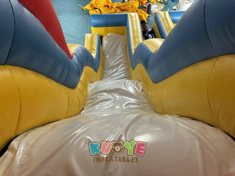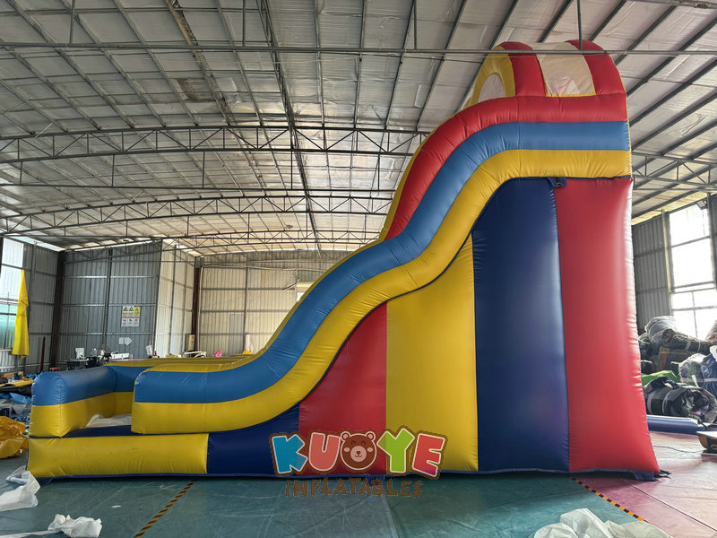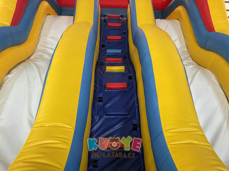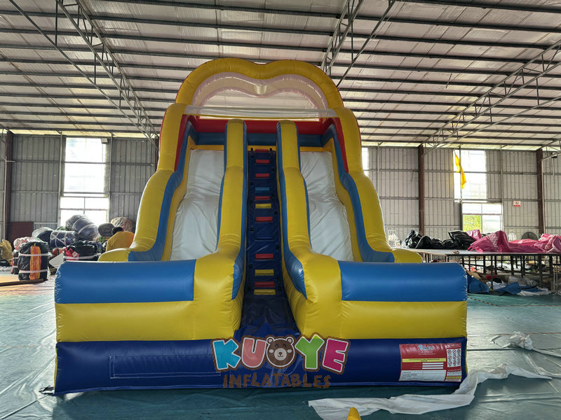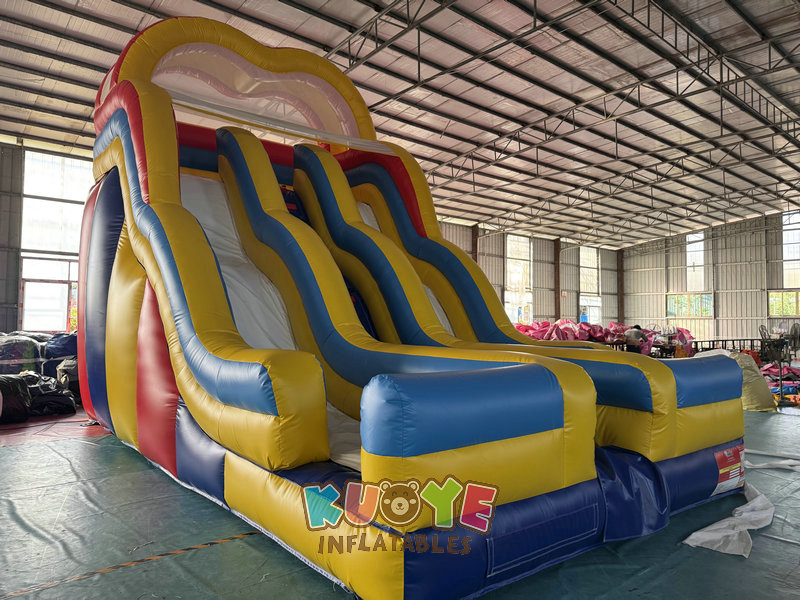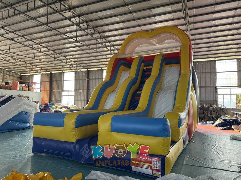This vibrant inflatable slide features a striking color scheme of bright yellow, bold blue, and classic red, accented by clean white sliding surfaces. Its multi-lane design is clearly visible, promising parallel fun and competition. The structure is tall and imposing, with a gently curved top that adds a dynamic visual element. The base is wide and stable, constructed with reinforced seams for durability. The visual appeal is further enhanced by the prominent KUOYE Inflatables logo, signaling quality manufacturing.